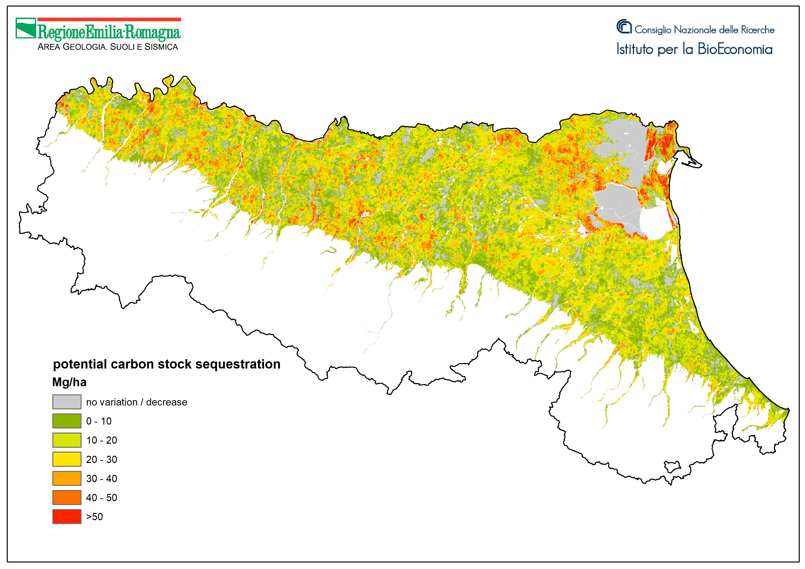 Potential carbon sequestration content in the 0-30 cm layer (Mg/ha). It provides an assessment of the extent of possible variations in carbon stock, given the same soil type, management, land use and climate in the soils of the Emilia-Romagna plain. Changes in SOCStock were estimated using the simplified (static) approach proposed by Stolbovoy et al. (2005, 2006).