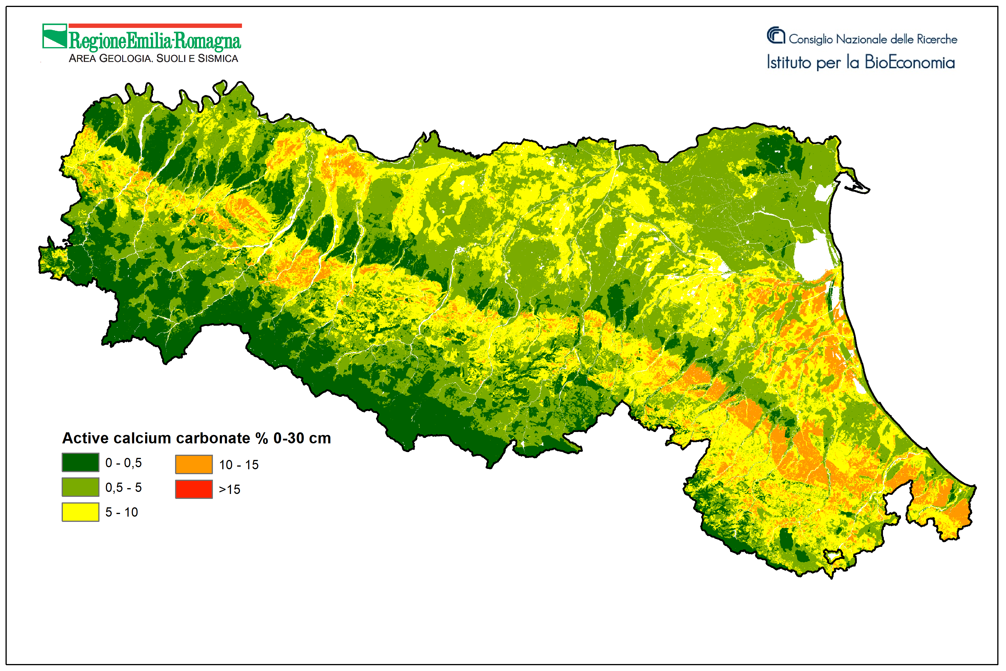 Active calcium carbonate is the finest fraction of total calcium carbonate and is easily soluble in the circulating solution. It therefore interacts most with the physiology of the root system and the absorption of various elements. In particular, it influences the availability of phosphorus and iron, forming highly insoluble compounds with them that cannot be assimilated by the plants. The presence or absence of active calcium carbonate can be limiting for some crops; in particular, many tree crops are sensitive to active calcium carbonate contents > 8-10%. The active calcium carbonate map, drawn up in collaboration with CNR-IBE, illustrates how soils are distributed across the region based on the active calcium carbonate content in the 0-30 cm layer. This map is a raster layer, with 100mx100m pixels.