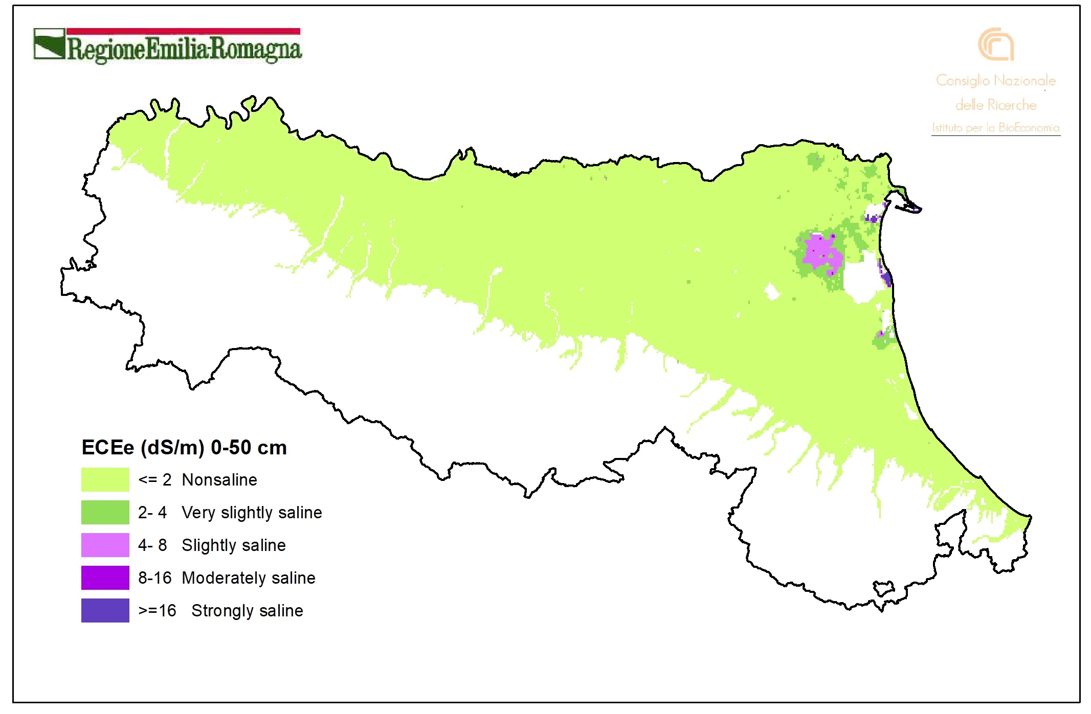 Following these indications and in accordance with the Regional Agricultural Extension Service salinity maps of the soils of Emilia-Romagna plain at 1:250,000 scale (first/second edition) have been prepared.