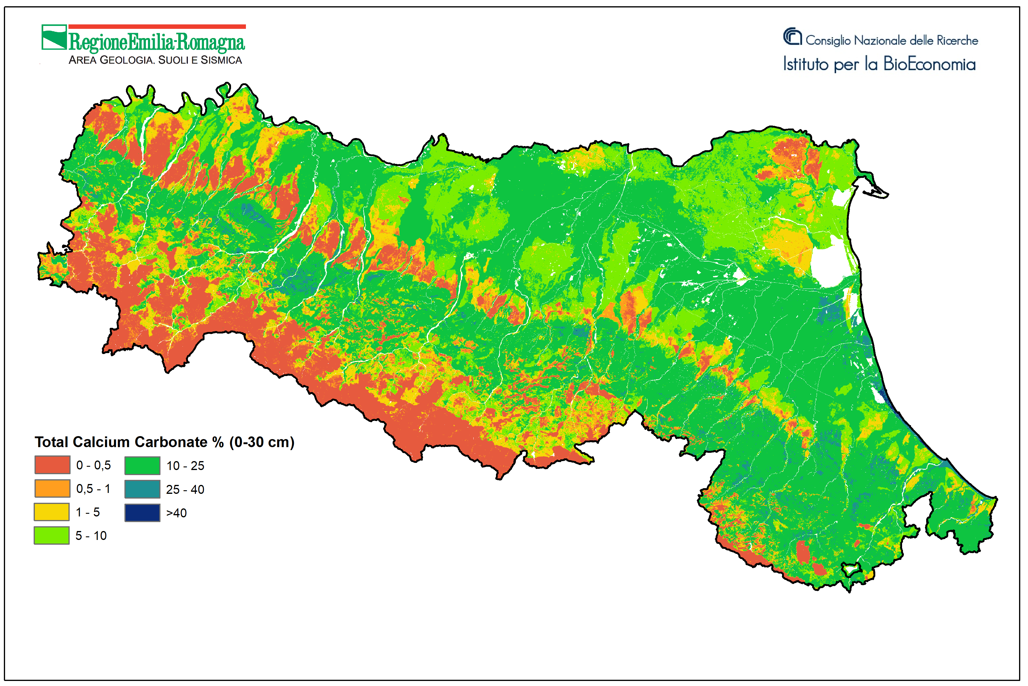 Total calcium carbonate is the mineral component of soil consisting mainly of calcium, magnesium, and sodium carbonates and is expressed as calcium carbonate (CaCO3), as this is the predominant element. The total calcium carbonate map, drawn up in collaboration with CNR-IBE, shows how soils are distributed across the region based on their total calcium carbonate content in the 0-30 cm layer. This map is a raster layer, with 100mx100m pixels.